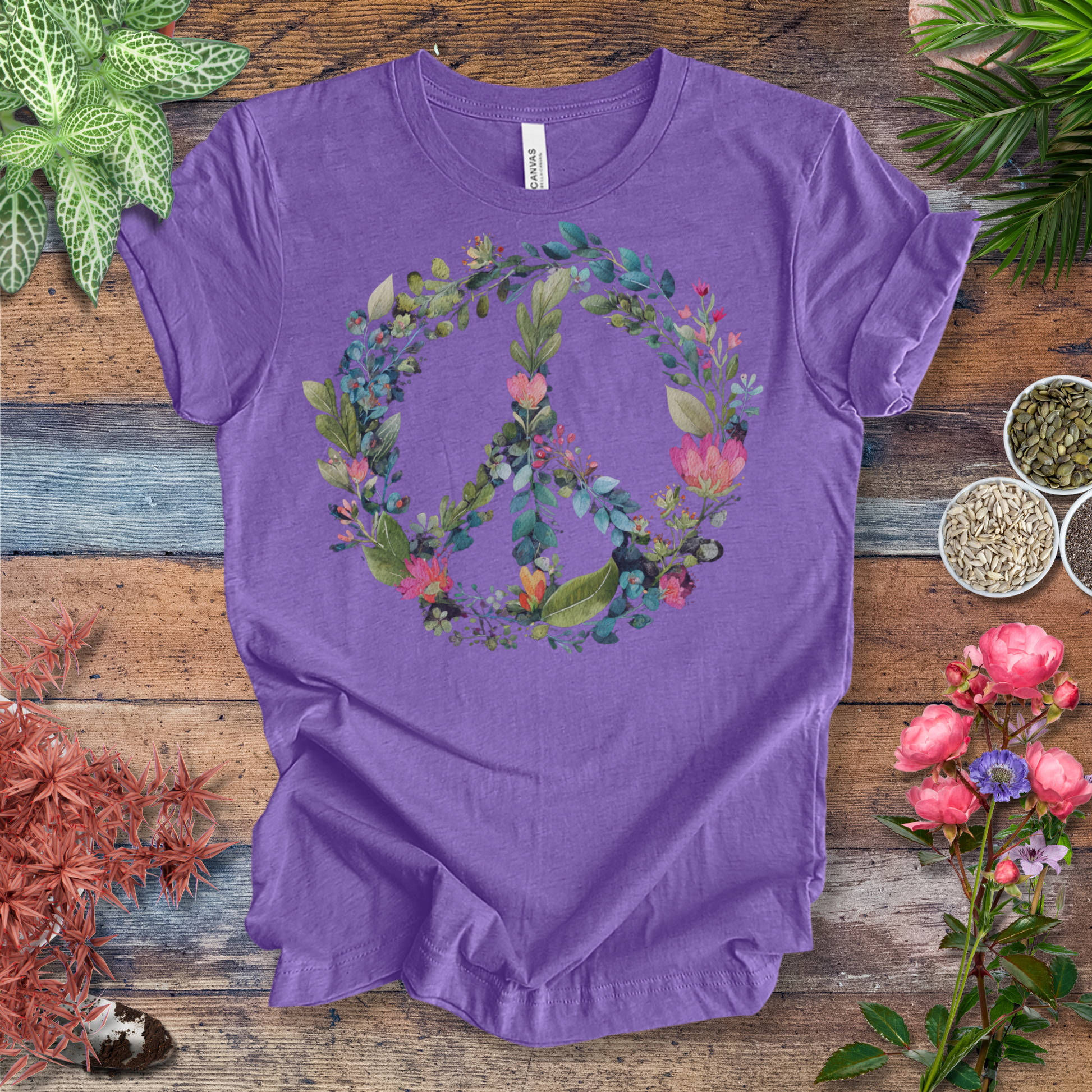 Vintage‑palette peace sign wrapped in blush blooms and eucalyptus leaves, printed sustainably on Bella+Canvas’ buttery Airlume cotton.